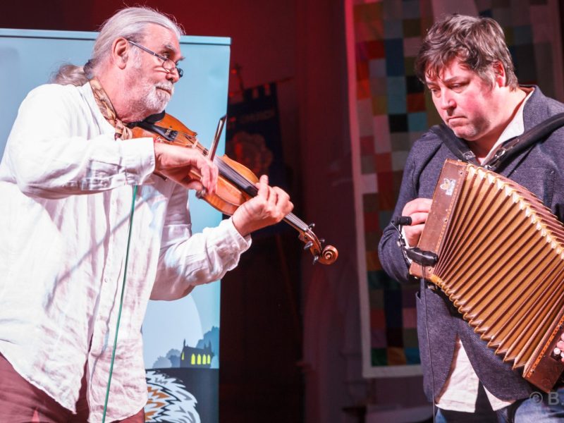 Then it all changes again. A series of French dance tunes are sprightly and fun. Spiers’ melodeon to the fore, pushing toes to tap, feet to pound the floor. Knight starts to twist the tunes in odd directions and Spiers grins while his squeezebox laughs an evil-goblin laugh. There are jaunty hornpipes, 800-year-old dance tunes and foot tappers of all types.