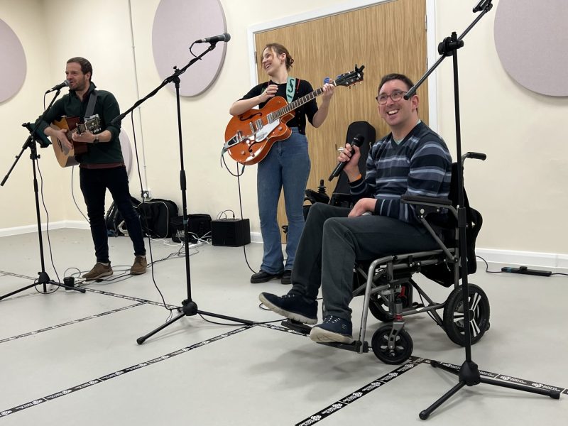 Dom, who has cerebral palsy and uses a wheelchair, regularly takes part in Music Train sessions.